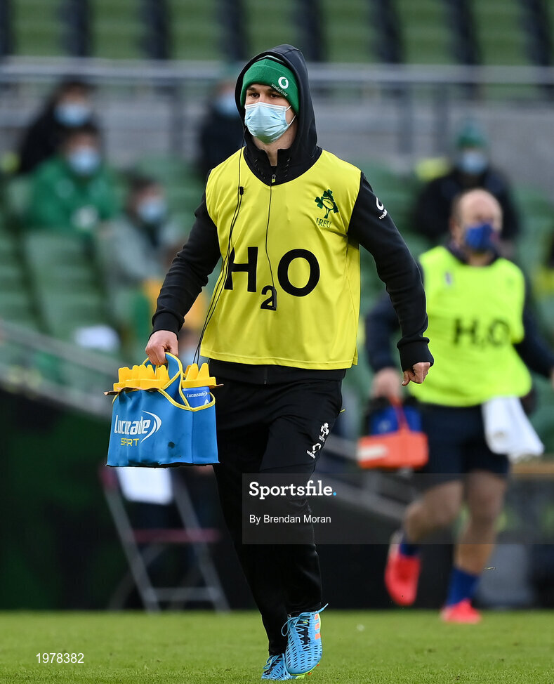 14 February 2021; Jonathan Sexton of Ireland acting as a water carrier during the Guinness Six Nations Rugby Championship match between Ireland and France at the Aviva Stadium in Dublin. Photo by Brendan Moran/Sportsfile