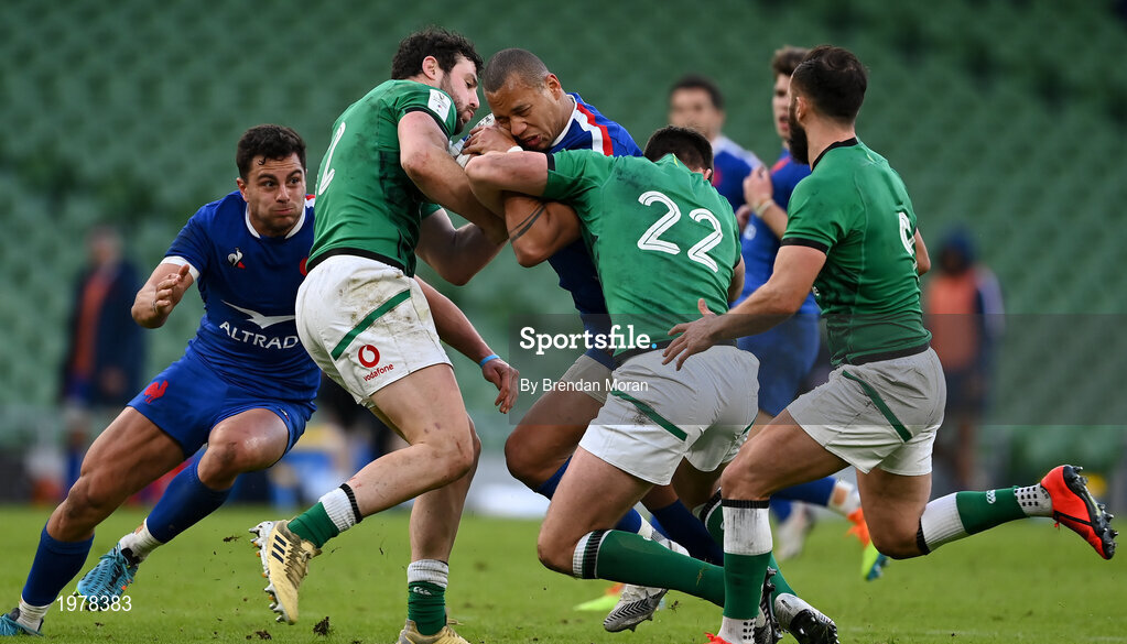 14 February 2021; Gaël Fickou of France is tackled by Robbie Henshaw and Ross Byrne of Ireland during the Guinness Six Nations Rugby Championship match between Ireland and France at the Aviva Stadium in Dublin. Photo by Brendan Moran/Sportsfile