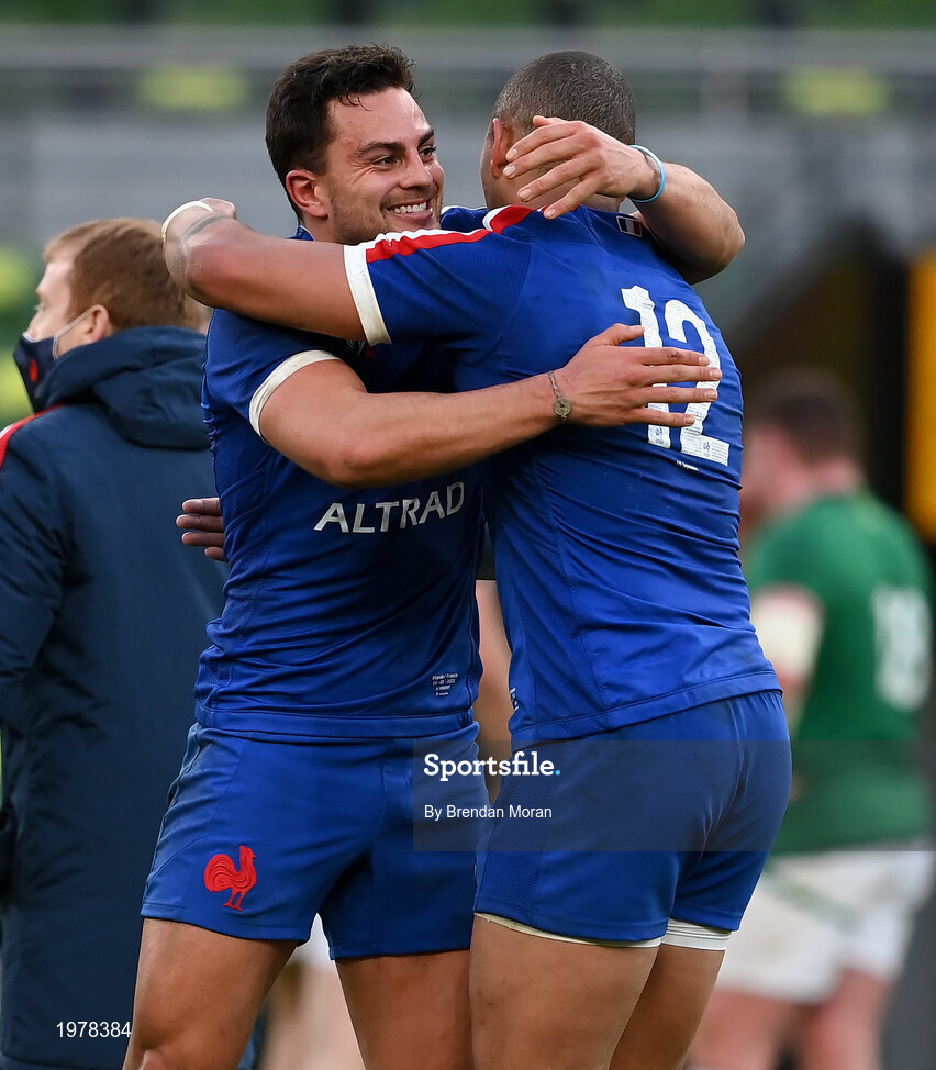 14 February 2021; Arthur Vincent, left, and Gaël Fickou of France celebrate after the Guinness Six Nations Rugby Championship match between Ireland and France at the Aviva Stadium in Dublin. Photo by Brendan Moran/Sportsfile