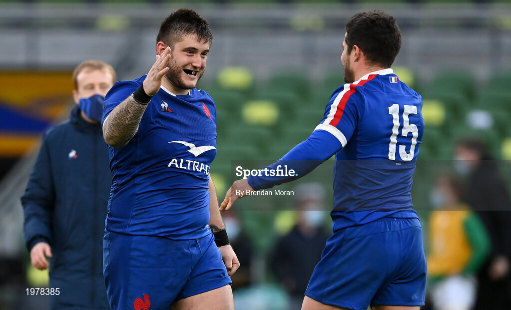14 February 2021; Cyril Baille, left, and Brice Dulin of France celebrate after the Guinness Six Nations Rugby Championship match between Ireland and France at the Aviva Stadium in Dublin. Photo by Brendan Moran/Sportsfile