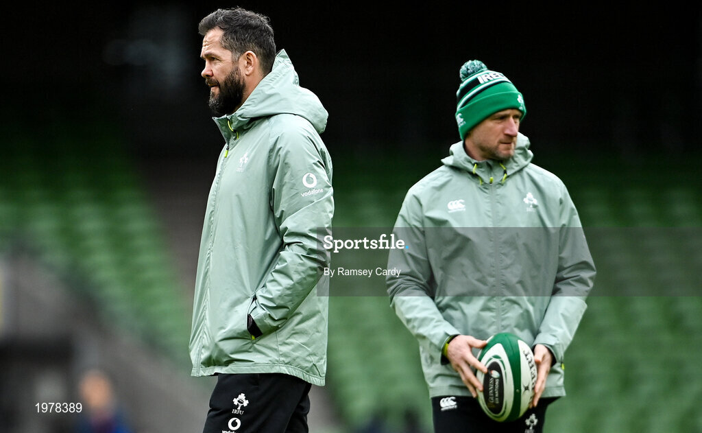 14 February 2021; Ireland head coach Andy Farrell, left, and assistant coach Mike Catt prior to the Guinness Six Nations Rugby Championship match between Ireland and France at the Aviva Stadium in Dublin. Photo by Ramsey Cardy/Sportsfile
