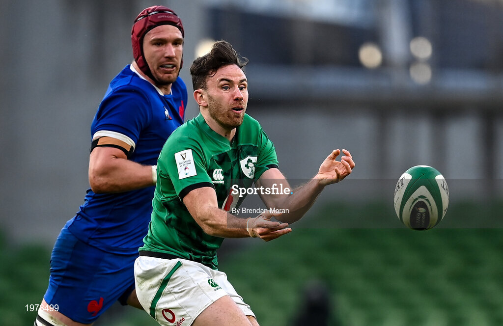 14 February 2021; Hugo Keenan of Ireland in action against Bernard Le Roux of France during the Guinness Six Nations Rugby Championship match between Ireland and France at the Aviva Stadium in Dublin. Photo by Brendan Moran/Sportsfile