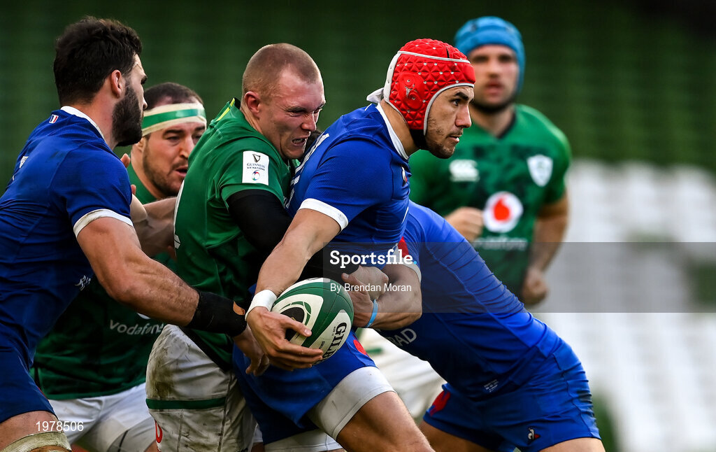 14 February 2021; Gabin Villière of France is tackled by Keith Earls of Ireland during the Guinness Six Nations Rugby Championship match between Ireland and France at the Aviva Stadium in Dublin. Photo by Brendan Moran/Sportsfile