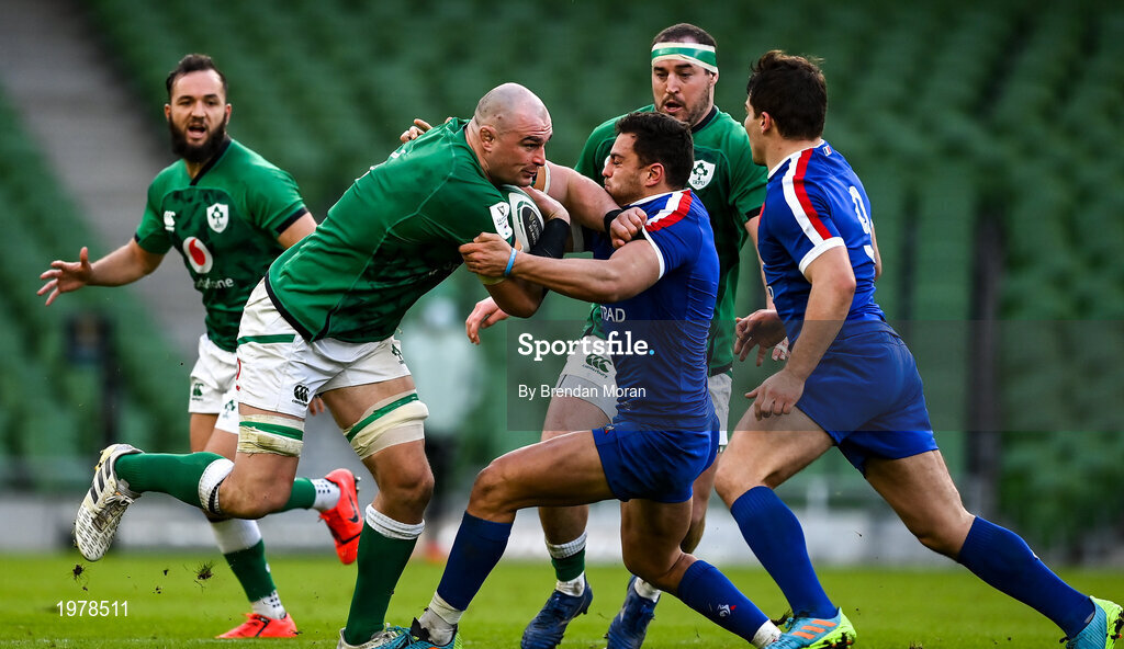 14 February 2021; Rhys Ruddock of Ireland is tackled by Arthur Vincent of France during the Guinness Six Nations Rugby Championship match between Ireland and France at the Aviva Stadium in Dublin. Photo by Brendan Moran/Sportsfile