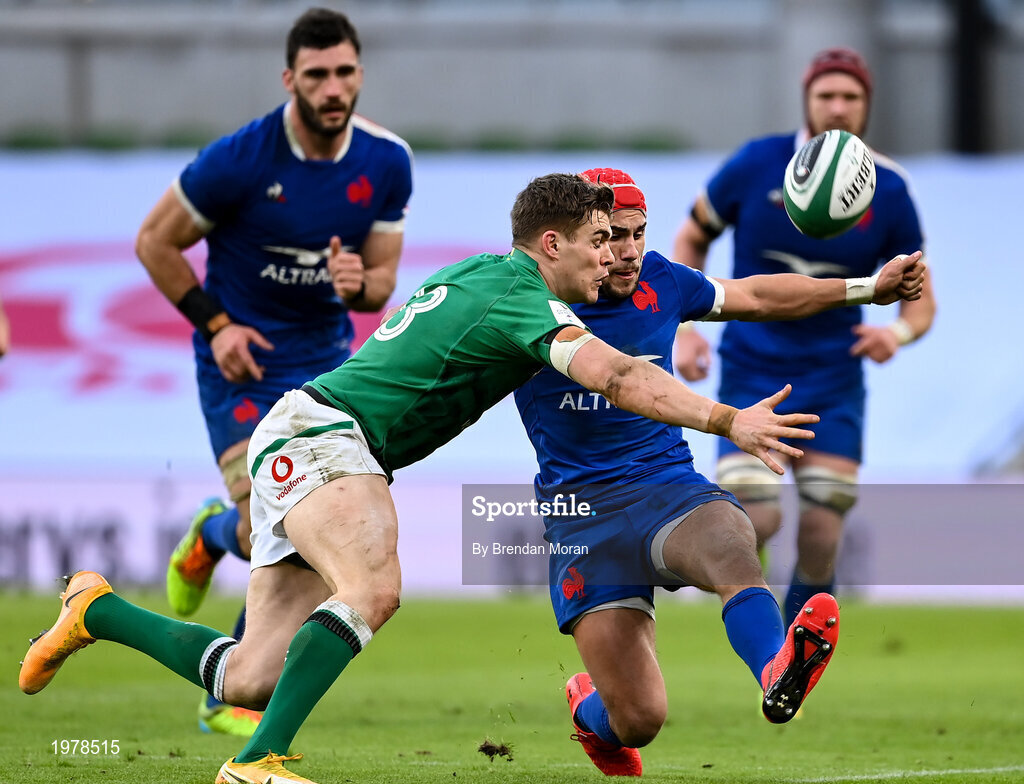 14 February 2021; Gabin Villière of France in action against Garry Ringrose of Ireland during the Guinness Six Nations Rugby Championship match between Ireland and France at the Aviva Stadium in Dublin. Photo by Brendan Moran/Sportsfile