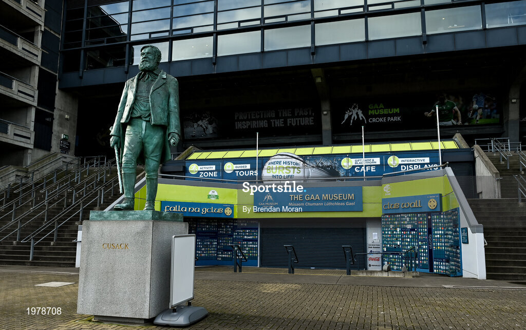 16 February 2021; A general view of the statue of Michael Cusack and the GAA Museum at Croke Park in Dublin. Photo by Brendan Moran/Sportsfile