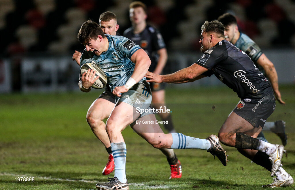 19 February 2021; Dan Sheehan of Leinster charges through to score his side's fourth try during the Guinness PRO14 match between Dragons and Leinster at Rodney Parade in Newport, Wales. Photo by Gareth Everett/Sportsfile