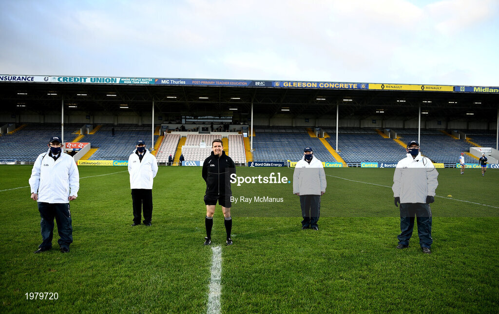 15 November 2020; Referee Colm Lyons and his umpires before the Munster GAA Hurling Senior Championship Final match between Limerick and Waterford at Semple Stadium in Thurles, Tipperary. Photo by Ray McManus/Sportsfile