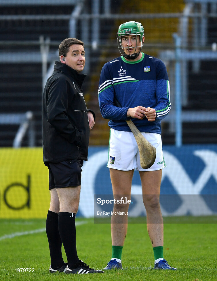 15 November 2020; Referee Colm Lyons talking to Nickie Quaid of Limerick before the Munster GAA Hurling Senior Championship Final match between Limerick and Waterford at Semple Stadium in Thurles, Tipperary. Photo by Ray McManus/Sportsfile