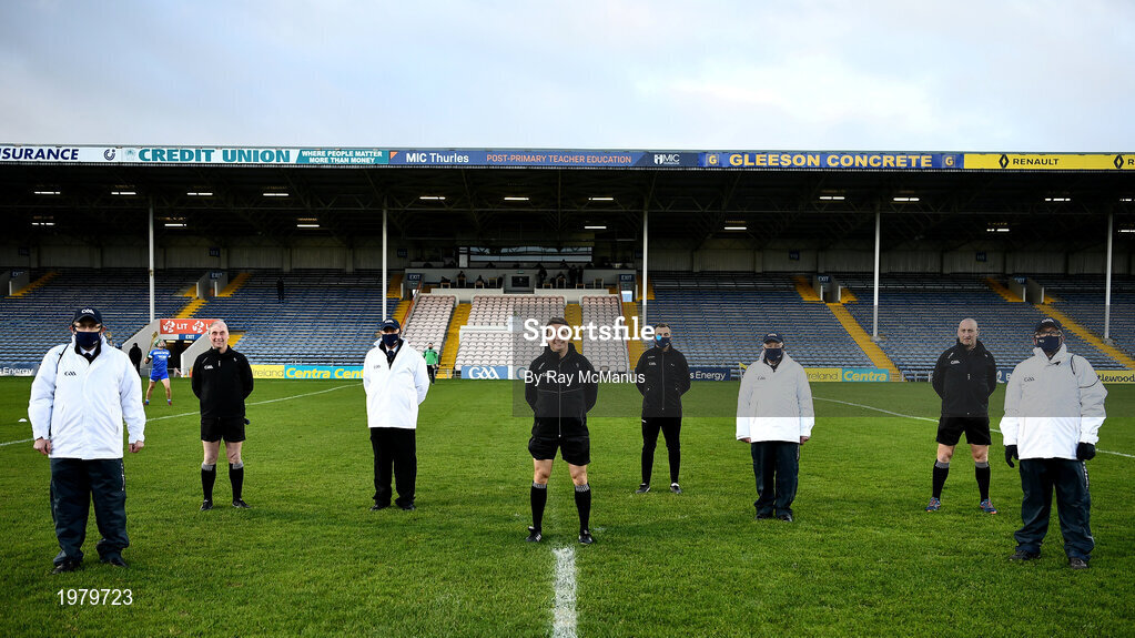 15 November 2020; Referee Colm Lyons, his limesmen and his umpires before the Munster GAA Hurling Senior Championship Final match between Limerick and Waterford at Semple Stadium in Thurles, Tipperary. Photo by Ray McManus/Sportsfile