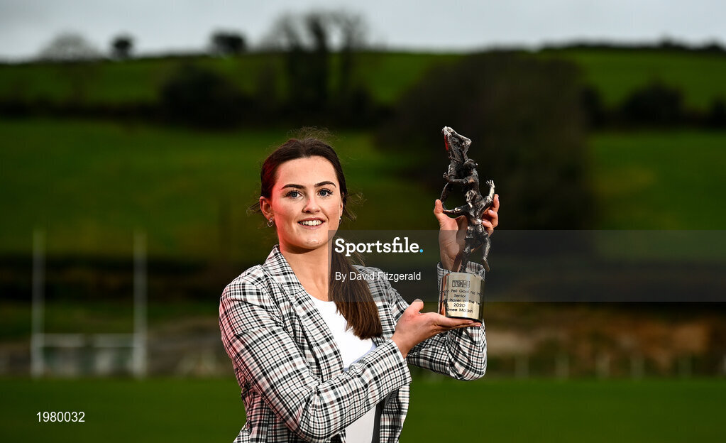 27 February 2021; Aimee Mackin of Armagh at her club Shane O'Neills with her 2020 TG4 Senior Players’ Player of the Year award at Camough in Armagh. Photo by David Fitzgerald/Sportsfile