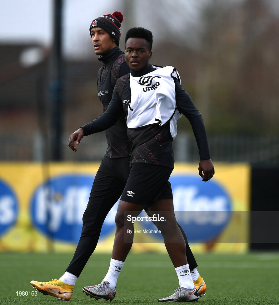 23 February 2021; Ebuka Kwelele, right, and Sonni Nattestad during a Dundalk Pre-Season training session at Oriel Park in Dundalk, Louth. Photo by Ben McShane/Sportsfile