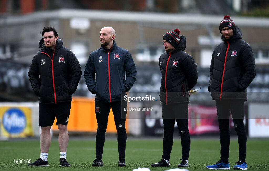 23 February 2021; Dundalk backroom staff, from left, physiotherapist David Murphy, strength and conditioning coach Graham Norton, sport scientist Lorcan Mason and part-time physiotherapist Conor Doran during a Dundalk Pre-Season training session at Oriel Park in Dundalk, Louth. Photo by Ben McShane/Sportsfile