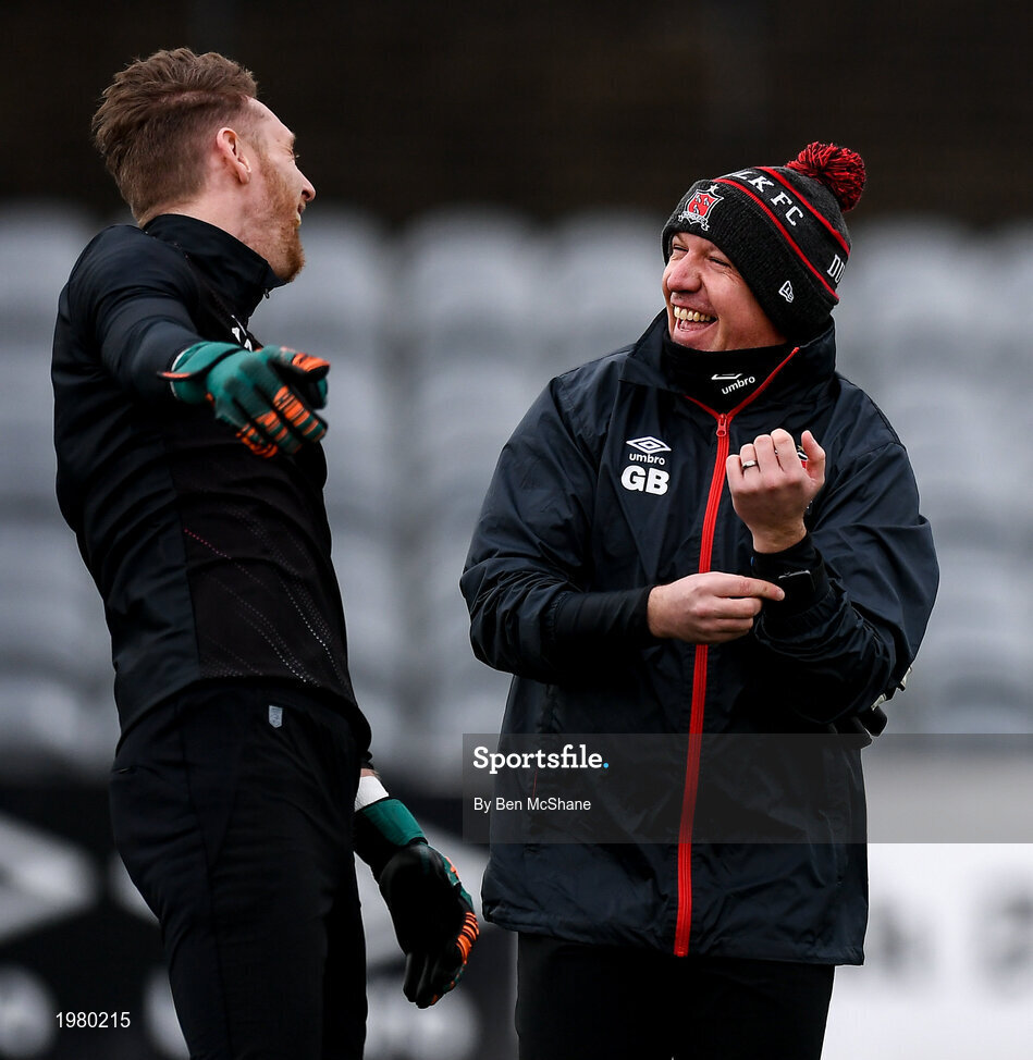 23 February 2021; Goalkeeping coach Graham Byas, right, and Peter Cherrie share a joke ahead of a Dundalk Pre-Season training session at Oriel Park in Dundalk, Louth. Photo by Ben McShane/Sportsfile