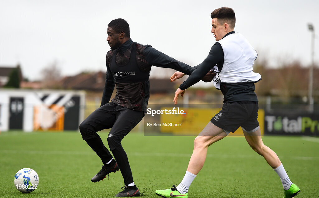 23 February 2021; Junior Ogedi-Uzokwe, left, and Darragh Leahy during a Dundalk Pre-Season training session at Oriel Park in Dundalk, Louth. Photo by Ben McShane/Sportsfile