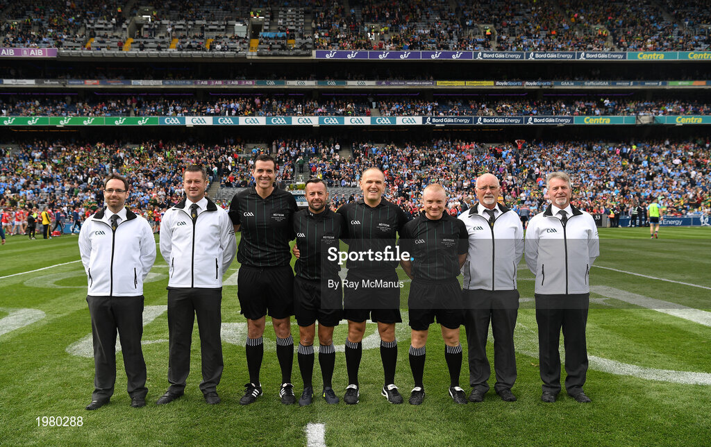 1 September 2019; Referee David Gough and all his officials before the GAA Football All-Ireland Senior Championship Final match between Dublin and Kerry at Croke Park in Dublin.