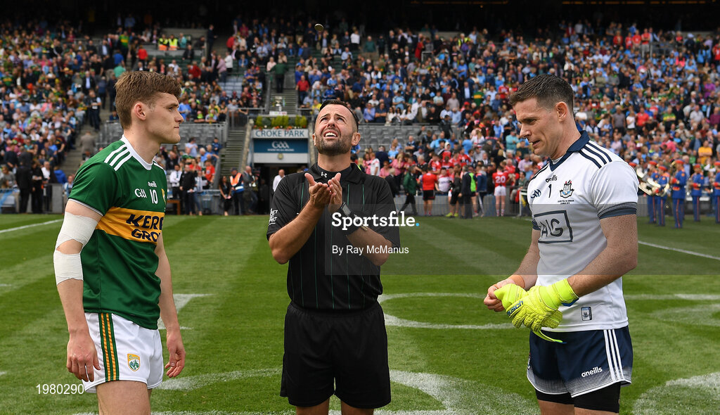 1 September 2019; Referee David Gough performs the coin toss with team captains Gavin White of Kerry and Stephen Cluxton of Dublin before the GAA Football All-Ireland Senior Championship Final match between Dublin and Kerry at Croke Park in Dublin.