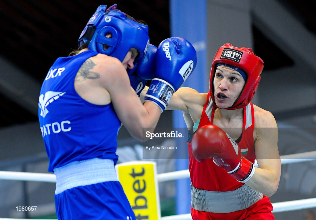 26 February 2021; Stanimira Petrova of Bulgaria, right, and Iuliia Tsyplakova of Ukraine during their women's lightweight 57kg semi-final bout at the AIBA Strandja Memorial Boxing Tournament in Sofia, Bulgaria. Photo by Alex Nicodim/Sportsfile