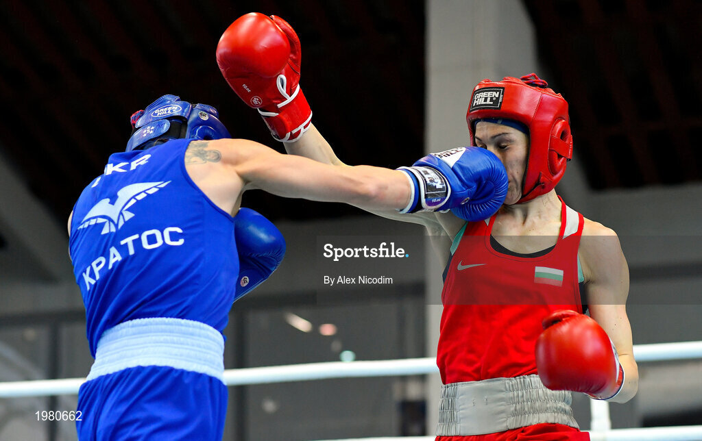 26 February 2021; Stanimira Petrova of Bulgaria, right, is hit by a punch from Iuliia Tsyplakova of Ukraine during their women's lightweight 57kg semi-final bout at the AIBA Strandja Memorial Boxing Tournament in Sofia, Bulgaria. Photo by Alex Nicodim/Sportsfile