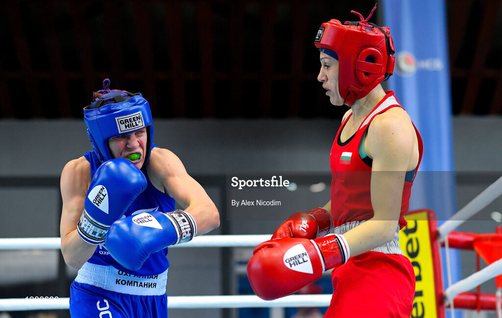 26 February 2021; Iuliia Tsyplakova of Ukraine, left, and Stanimira Petrova of Bulgaria during their women's lightweight 57kg semi-final bout at the AIBA Strandja Memorial Boxing Tournament in Sofia, Bulgaria. Photo by Alex Nicodim/Sportsfile