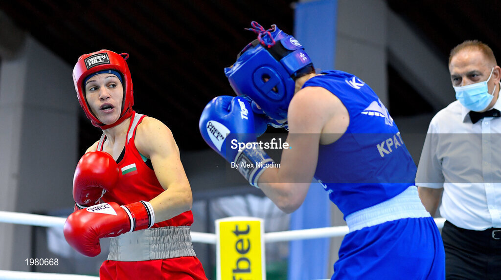 26 February 2021; Stanimira Petrova of Bulgaria, left, and Iuliia Tsyplakova of Ukraine during their women's lightweight 57kg semi-final bout at the AIBA Strandja Memorial Boxing Tournament in Sofia, Bulgaria. Photo by Alex Nicodim/Sportsfile