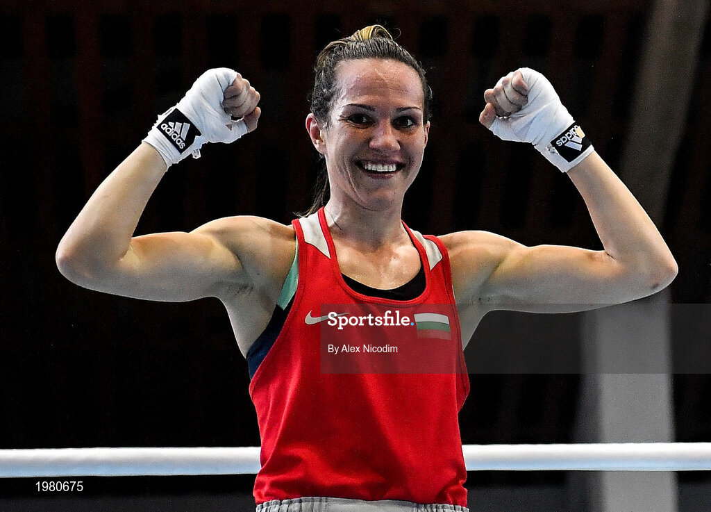 26 February 2021; Stanimira Petrova of Bulgaria is declared vicorious over Iuliia Tsyplakova of Ukraine following their women's lightweight 57kg semi-final bout at the AIBA Strandja Memorial Boxing Tournament in Sofia, Bulgaria. Photo by Alex Nicodim/Sportsfile
