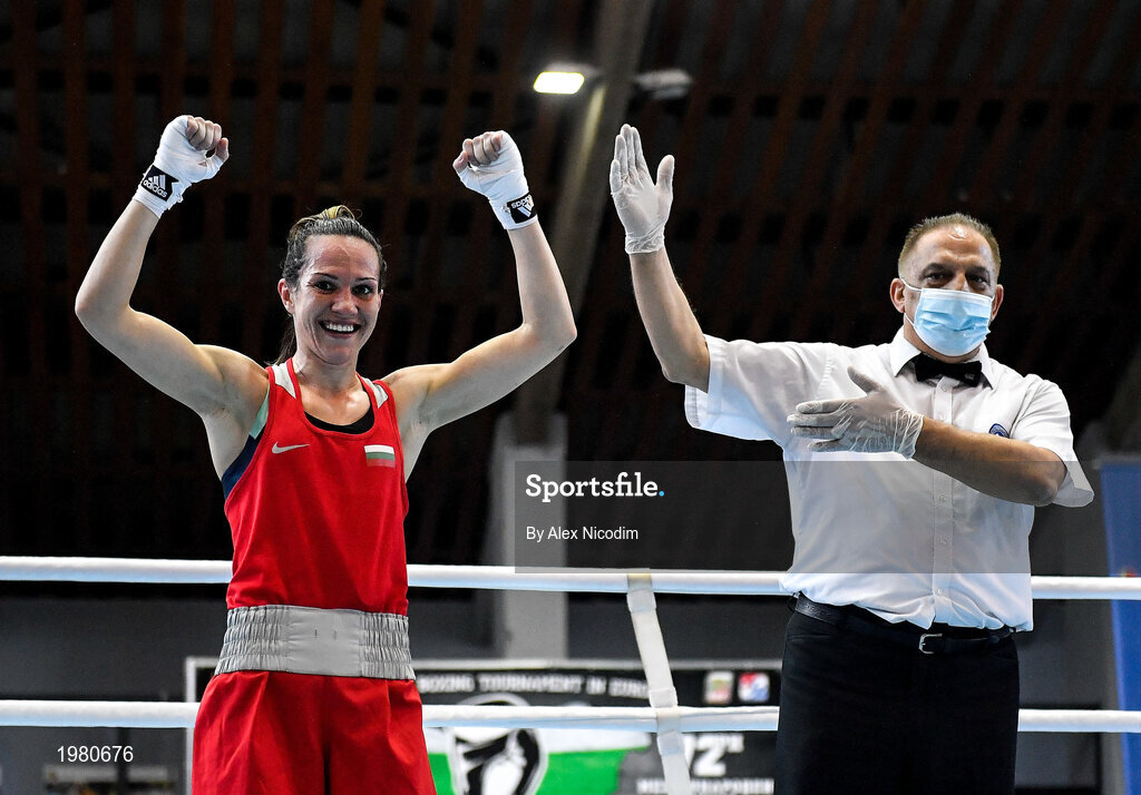 26 February 2021; Stanimira Petrova of Bulgaria, left, is declared vicorious over Iuliia Tsyplakova of Ukraine following their women's lightweight 57kg semi-final bout at the AIBA Strandja Memorial Boxing Tournament in Sofia, Bulgaria. Photo by Alex Nicodim/Sportsfile