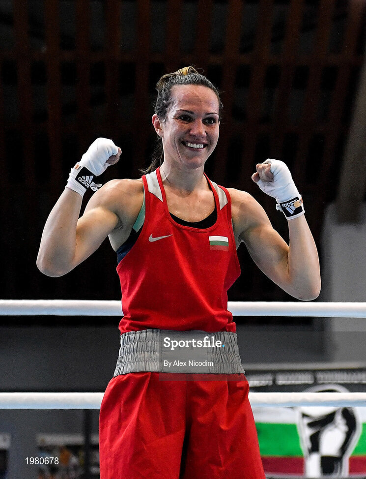 26 February 2021; Stanimira Petrova of Bulgaria is declared vicorious over Iuliia Tsyplakova of Ukraine following their women's lightweight 57kg semi-final bout at the AIBA Strandja Memorial Boxing Tournament in Sofia, Bulgaria. Photo by Alex Nicodim/Sportsfile