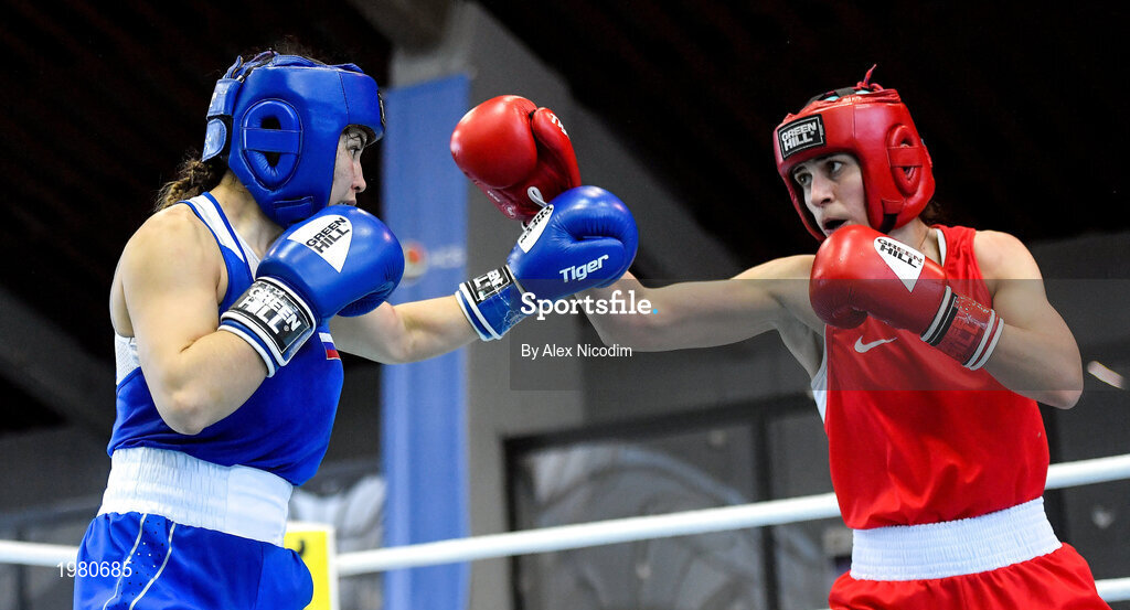 26 February 2021; Karina Tazabekova of Russia, left, and Svetlana Kamenova of Bulgaria during their women's lightweight 57kg semi-final bout at the AIBA Strandja Memorial Boxing Tournament in Sofia, Bulgaria. Photo by Alex Nicodim/Sportsfile
