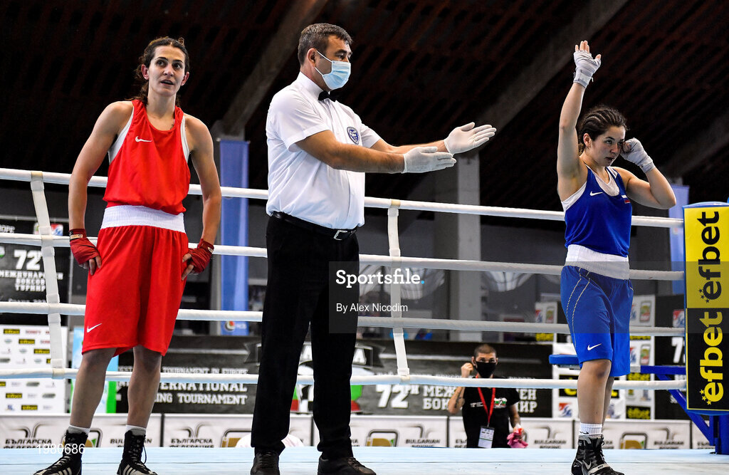 26 February 2021; Svetlana Kamenova of Bulgaria, left, is declared victorious over Karina Tazabekova of Russia following their women's lightweight 57kg semi-final bout at the AIBA Strandja Memorial Boxing Tournament in Sofia, Bulgaria. Photo by Alex Nicodim/Sportsfile