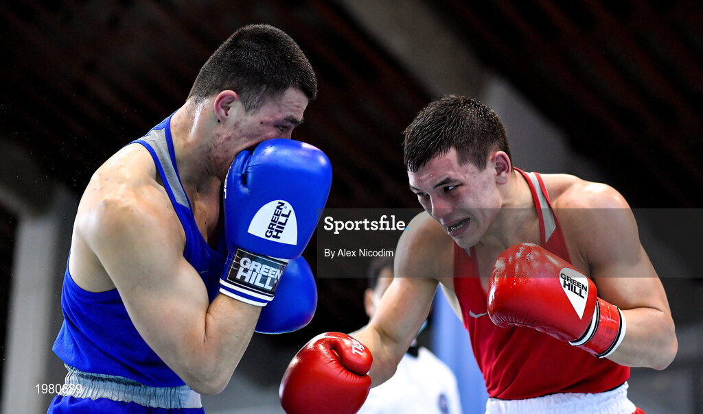 26 February 2021; Pavel Sosulin of Russia, right, and Nurkanat Raiys of Kazakhstan during their men's middleweight 75kg semi-final bout at the AIBA Strandja Memorial Boxing Tournament in Sofia, Bulgaria. Photo by Alex Nicodim/Sportsfile