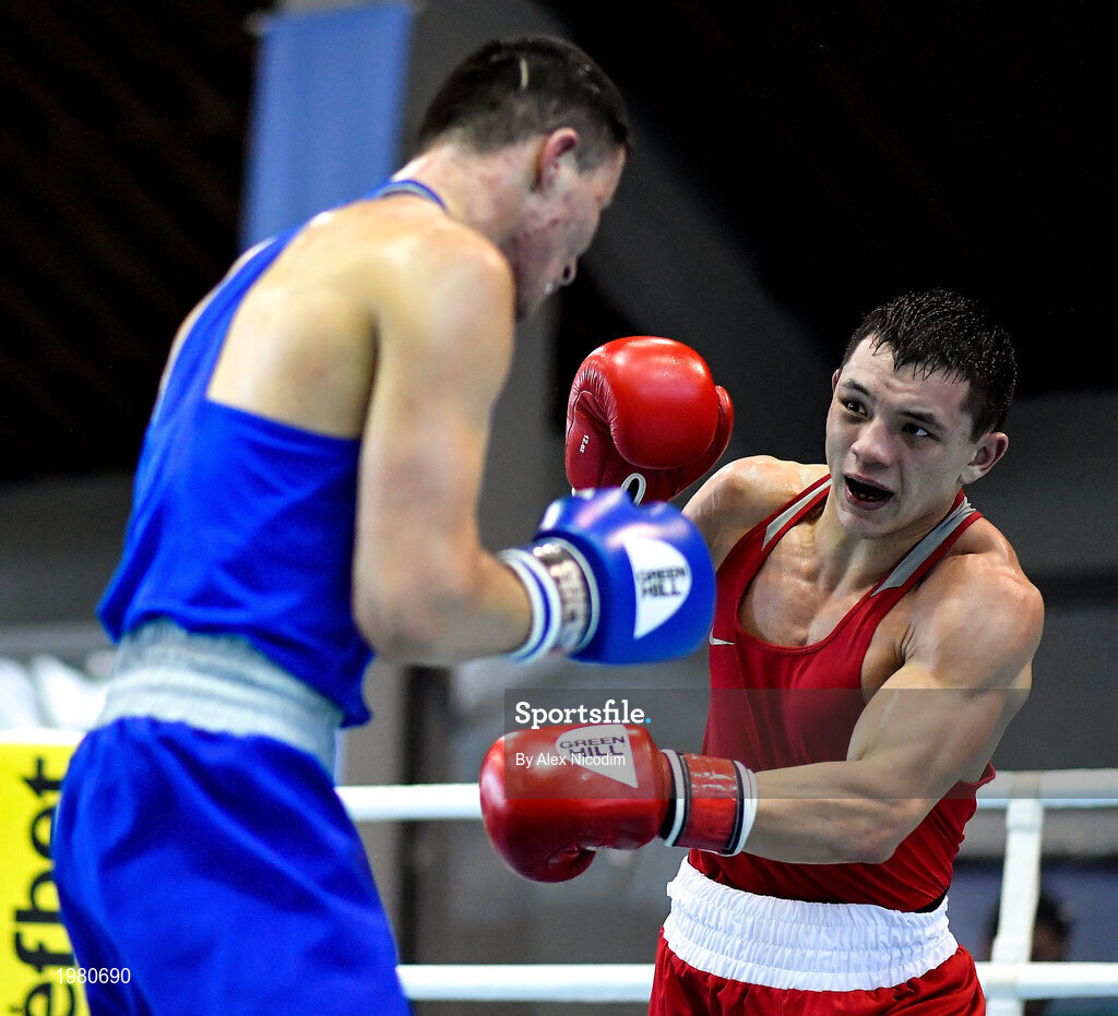 26 February 2021; Pavel Sosulin of Russia, right, and Nurkanat Raiys of Kazakhstan during their men's middleweight 75kg semi-final bout at the AIBA Strandja Memorial Boxing Tournament in Sofia, Bulgaria. Photo by Alex Nicodim/Sportsfile