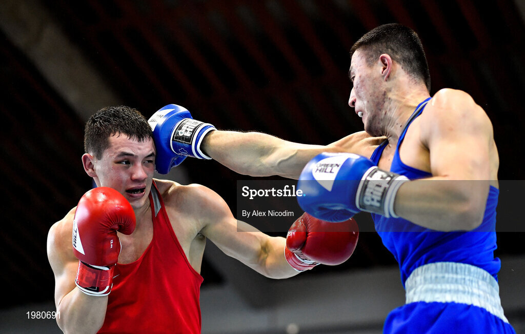 26 February 2021; Pavel Sosulin of Russia, left, and Nurkanat Raiys of Kazakhstan during their men's middleweight 75kg semi-final bout at the AIBA Strandja Memorial Boxing Tournament in Sofia, Bulgaria. Photo by Alex Nicodim/Sportsfile