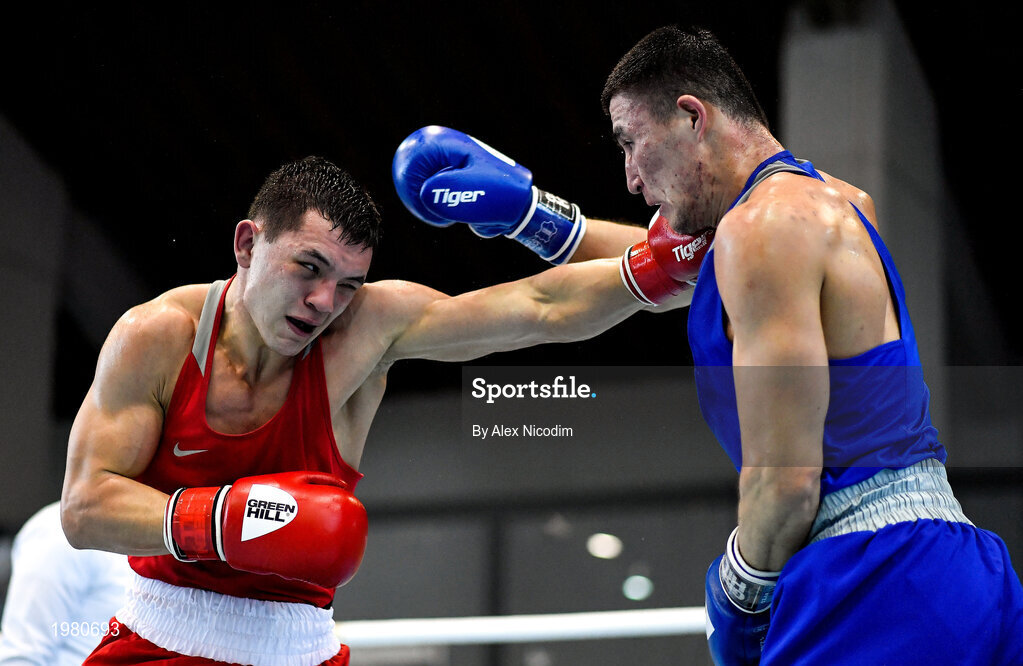 26 February 2021; Pavel Sosulin of Russia, left, and Nurkanat Raiys of Kazakhstan during their men's middleweight 75kg semi-final bout at the AIBA Strandja Memorial Boxing Tournament in Sofia, Bulgaria. Photo by Alex Nicodim/Sportsfile