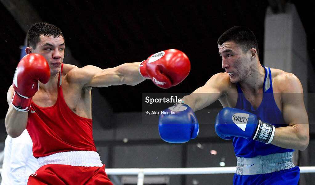 26 February 2021; Pavel Sosulin of Russia, left, and Nurkanat Raiys of Kazakhstan during their men's middleweight 75kg semi-final bout at the AIBA Strandja Memorial Boxing Tournament in Sofia, Bulgaria. Photo by Alex Nicodim/Sportsfile