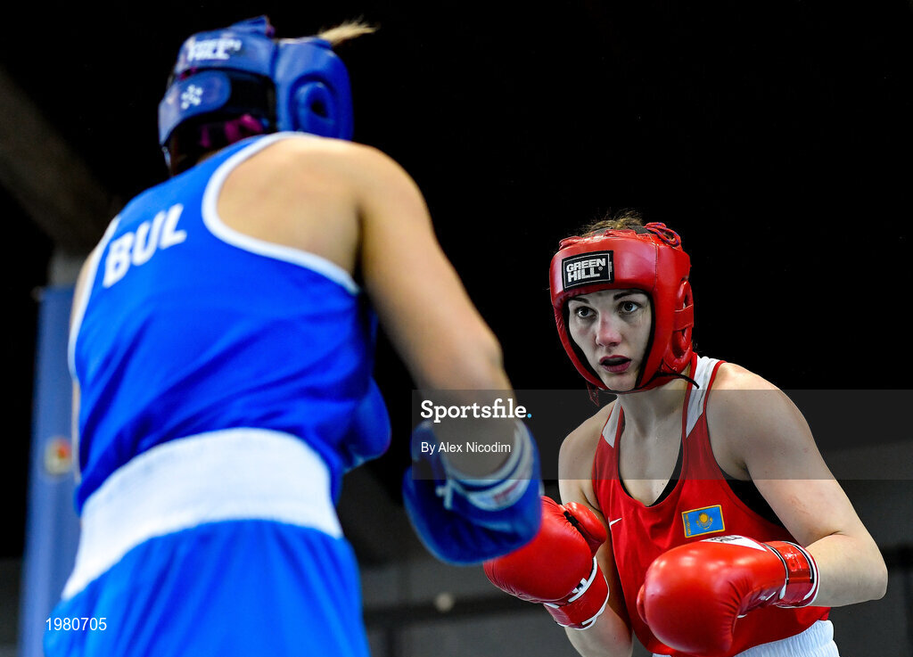26 February 2021; Valentina Khalzova of Kazakhstan, right, and Melis Yonuzova of Bulgaria during their women's welterweight 69kg semi-final bout at the AIBA Strandja Memorial Boxing Tournament in Sofia, Bulgaria. Photo by Alex Nicodim/Sportsfile