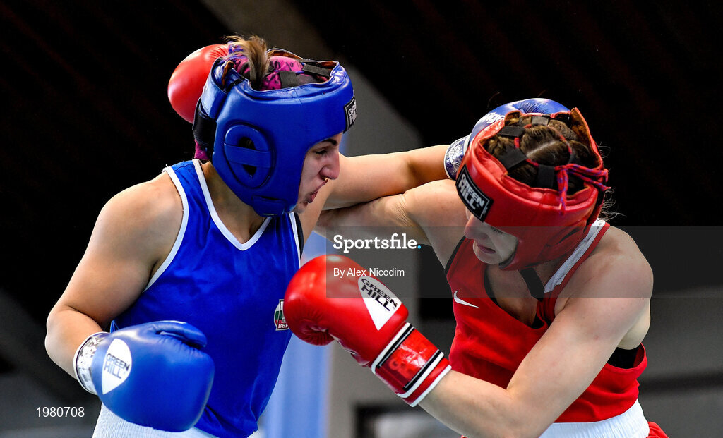 26 February 2021; Valentina Khalzova of Kazakhstan, right, and Melis Yonuzova of Bulgaria during their women's welterweight 69kg semi-final bout at the AIBA Strandja Memorial Boxing Tournament in Sofia, Bulgaria. Photo by Alex Nicodim/Sportsfile