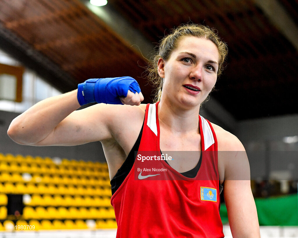 26 February 2021; Valentina Khalzova of Kazakhstan following victory over Melis Yonuzova of Bulgaria during their women's welterweight 69kg semi-final bout at the AIBA Strandja Memorial Boxing Tournament in Sofia, Bulgaria. Photo by Alex Nicodim/Sportsfile