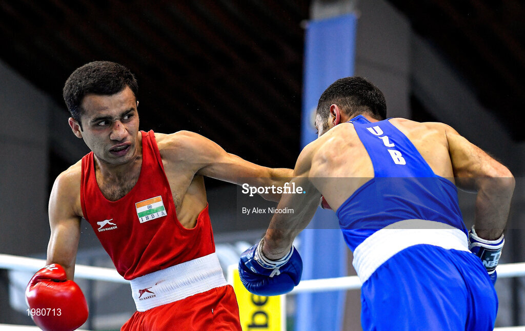 26 February 2021; Deepak Komar of India, left, and Shakhobidin Zoirov of Uzbekistan during their men's flyweight 52kg semi-final bout at the AIBA Strandja Memorial Boxing Tournament in Sofia, Bulgaria. Photo by Alex Nicodim/Sportsfile