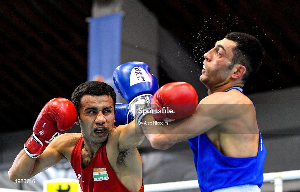 26 February 2021; Deepak Komar of India, left, and Shakhobidin Zoirov of Uzbekistan during their men's flyweight 52kg semi-final bout at the AIBA Strandja Memorial Boxing Tournament in Sofia, Bulgaria. Photo by Alex Nicodim/Sportsfile