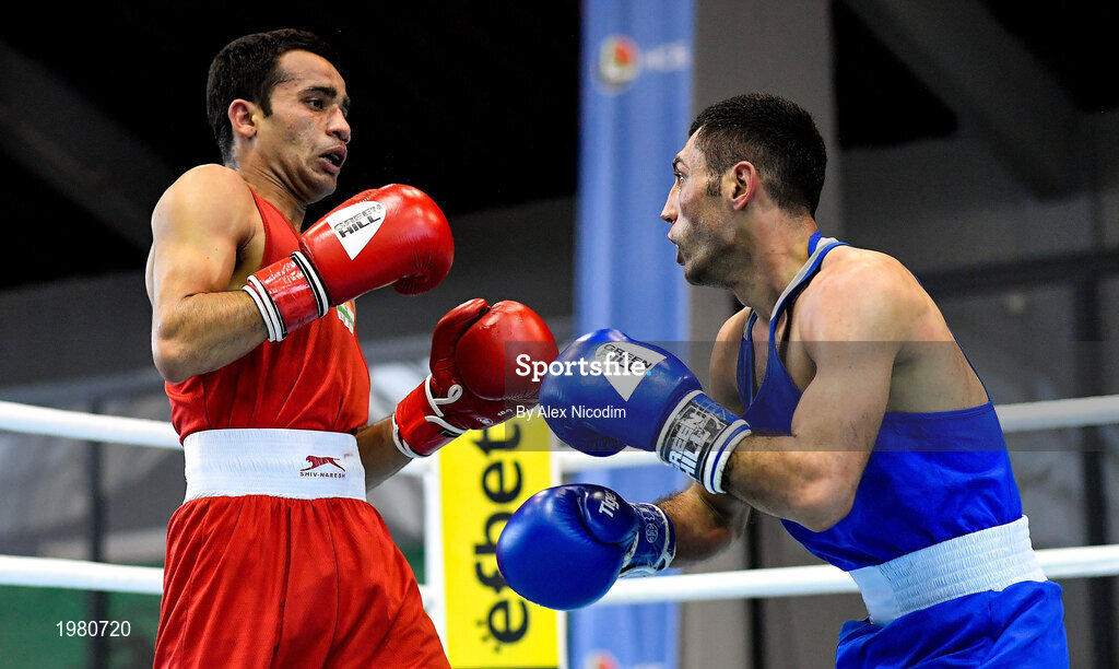 26 February 2021; Deepak Komar of India, left, and Shakhobidin Zoirov of Uzbekistan during their men's flyweight 52kg semi-final bout at the AIBA Strandja Memorial Boxing Tournament in Sofia, Bulgaria. Photo by Alex Nicodim/Sportsfile