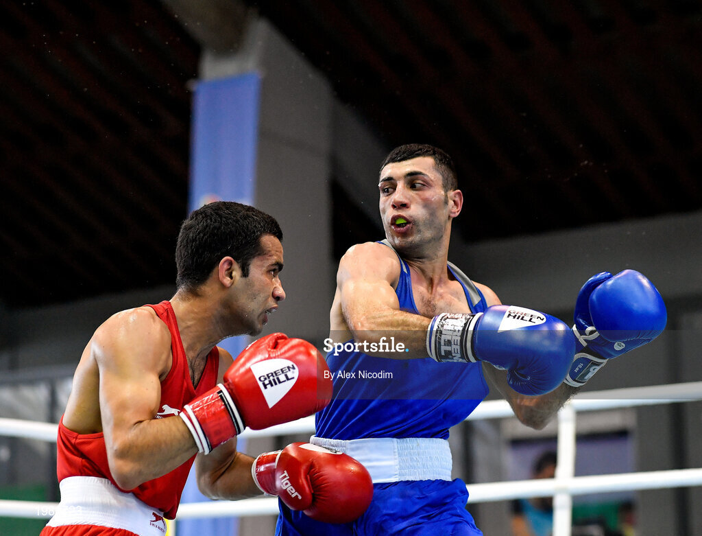 26 February 2021; Deepak Komar of India, left, and Shakhobidin Zoirov of Uzbekistan during their men's flyweight 52kg semi-final bout at the AIBA Strandja Memorial Boxing Tournament in Sofia, Bulgaria. Photo by Alex Nicodim/Sportsfile