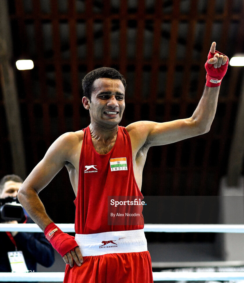 26 February 2021; Deepak Komar of India is declared victorious over Shakhobidin Zoirov of Uzbekistan during their men's flyweight 52kg semi-final bout at the AIBA Strandja Memorial Boxing Tournament in Sofia, Bulgaria. Photo by Alex Nicodim/Sportsfile