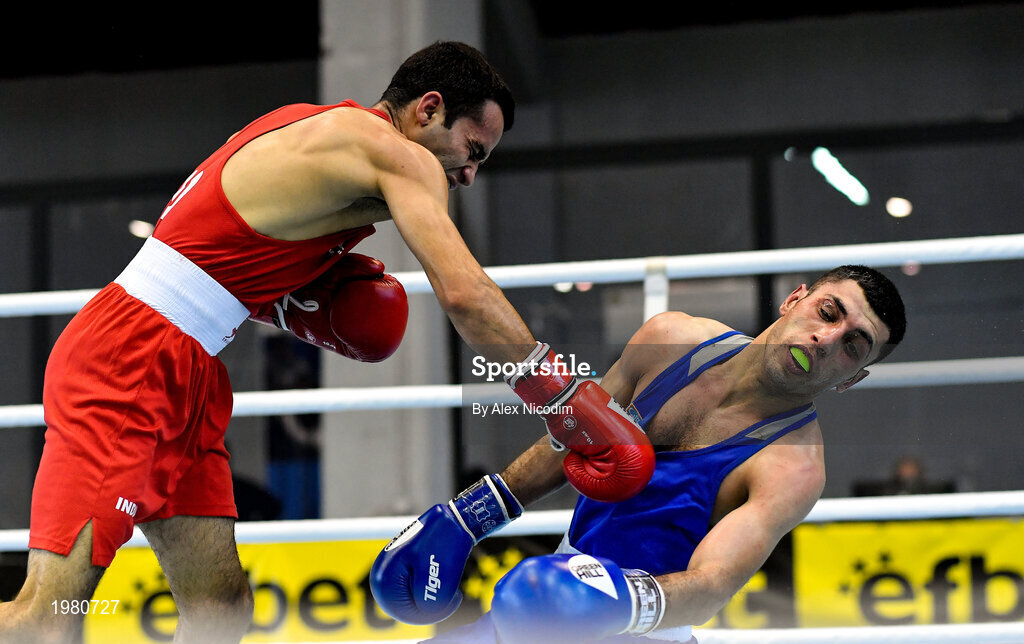 26 February 2021; Deepak Komar of India, left, and Shakhobidin Zoirov of Uzbekistan during their men's flyweight 52kg semi-final bout at the AIBA Strandja Memorial Boxing Tournament in Sofia, Bulgaria. Photo by Alex Nicodim/Sportsfile