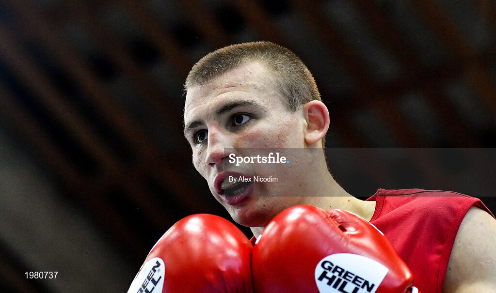 26 February 2021; Oleksandr Khyzhniak of Ukraine during his men's middleweight 75kg semi-final bout against Andrei Vreme of Moldova at the AIBA Strandja Memorial Boxing Tournament in Sofia, Bulgaria. Photo by Alex Nicodim/Sportsfile