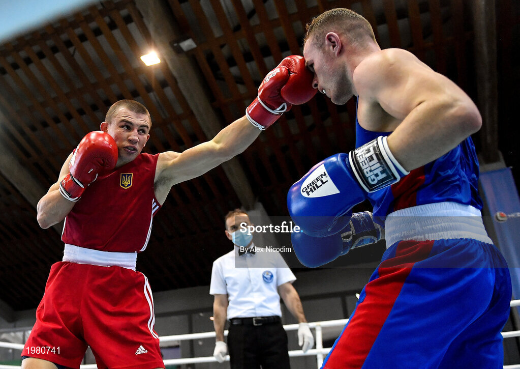 26 February 2021; Oleksandr Khyzhniak of Ukraine, left, and Andrei Vreme of Moldova during their men's middleweight 75kg semi-final bout at the AIBA Strandja Memorial Boxing Tournament in Sofia, Bulgaria. Photo by Alex Nicodim/Sportsfile