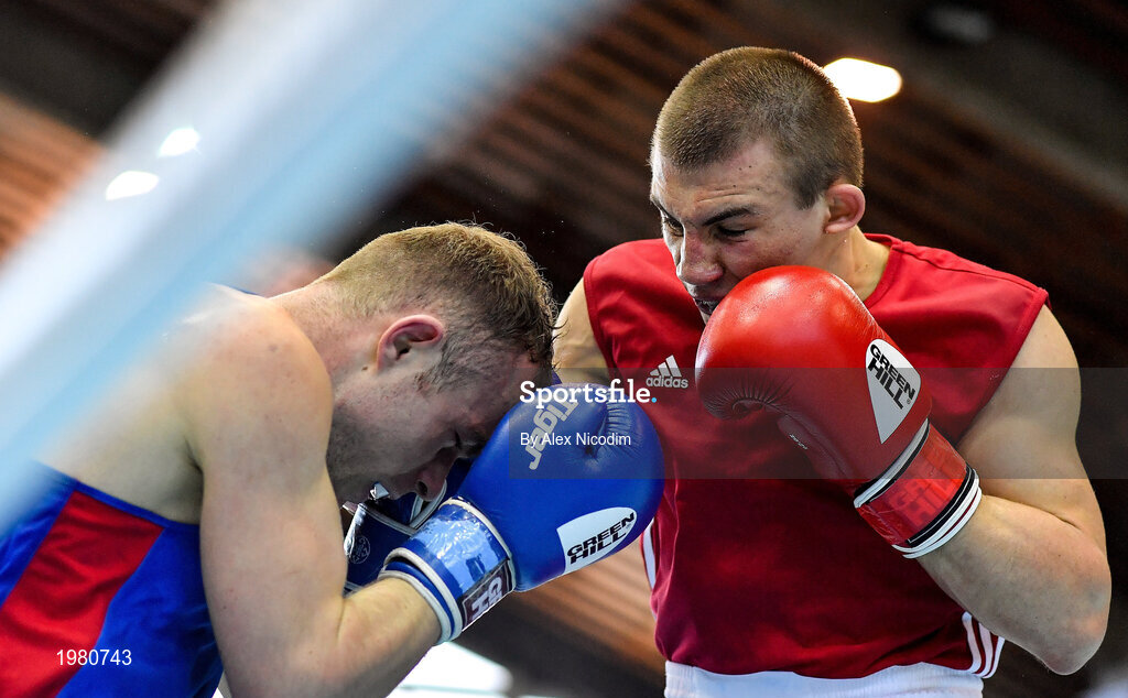26 February 2021; Oleksandr Khyzhniak of Ukraine, right, and Andrei Vreme of Moldova during their men's middleweight 75kg semi-final bout at the AIBA Strandja Memorial Boxing Tournament in Sofia, Bulgaria. Photo by Alex Nicodim/Sportsfile