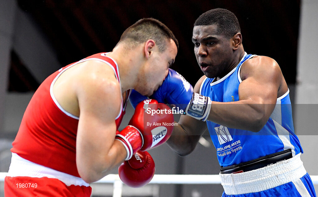 26 February 2021; Wilfried Florentin of France, right, and Radoslav Pantaleev of Bulgaria during their men's heavyweight 91kg semi-final bout at the AIBA Strandja Memorial Boxing Tournament in Sofia, Bulgaria. Photo by Alex Nicodim/Sportsfile