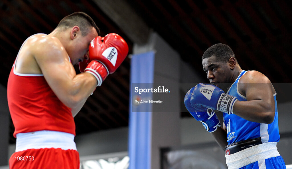 26 February 2021; Wilfried Florentin of France, right, and Radoslav Pantaleev of Bulgaria during their men's heavyweight 91kg semi-final bout at the AIBA Strandja Memorial Boxing Tournament in Sofia, Bulgaria. Photo by Alex Nicodim/Sportsfile