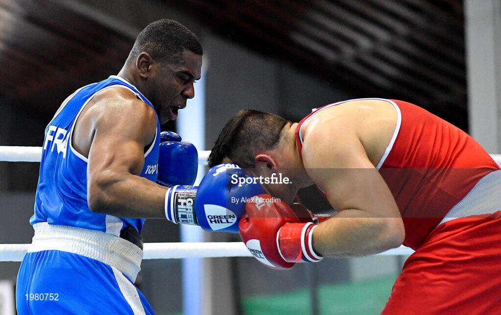 26 February 2021; Wilfried Florentin of France, left, and Radoslav Pantaleev of Bulgaria during their men's heavyweight 91kg semi-final bout at the AIBA Strandja Memorial Boxing Tournament in Sofia, Bulgaria. Photo by Alex Nicodim/Sportsfile